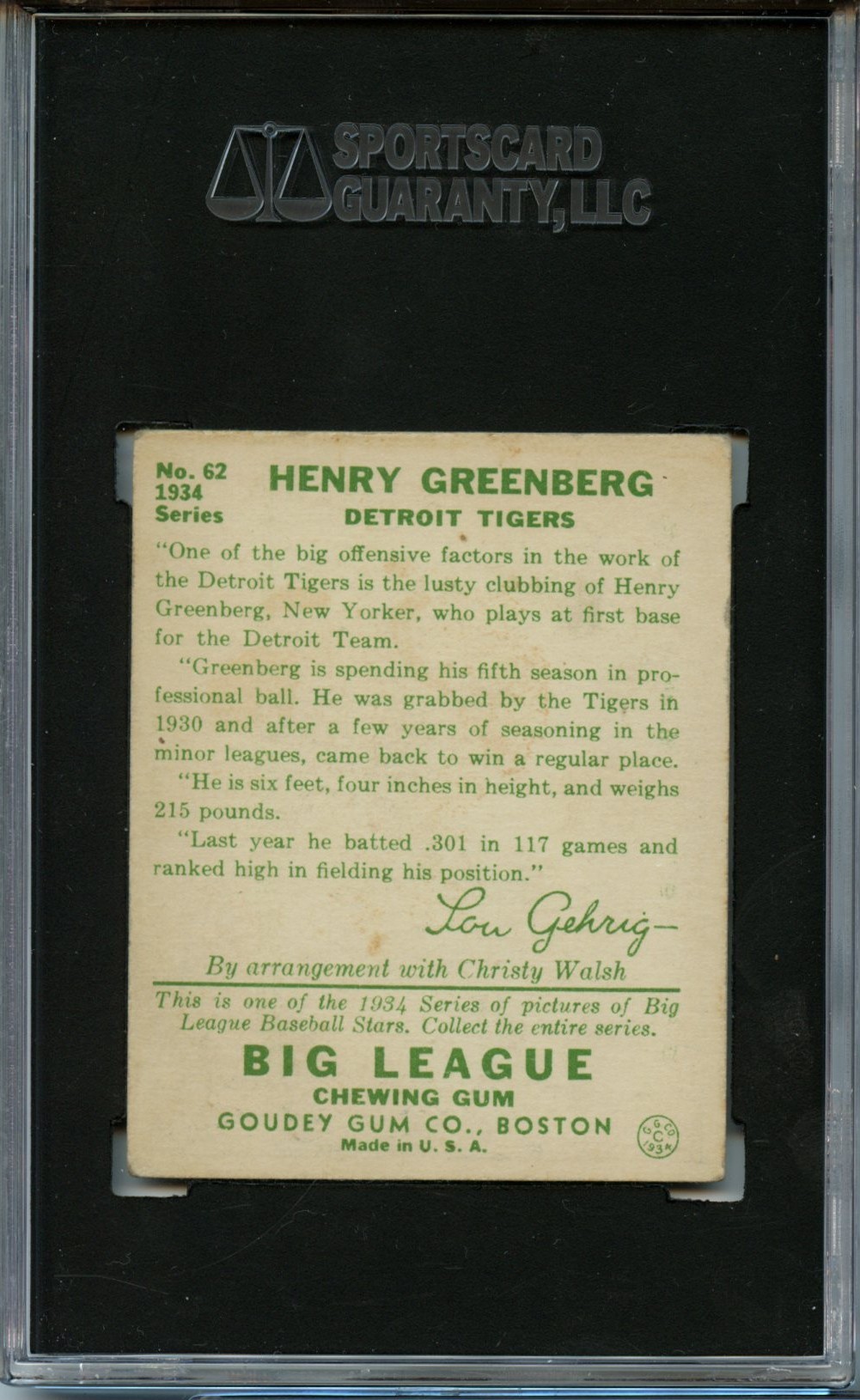 | Description: | 1934 Goudey - Hank Greenberg ROOKIE #62 HOF - Tigers - SGC 60 EX 5 |